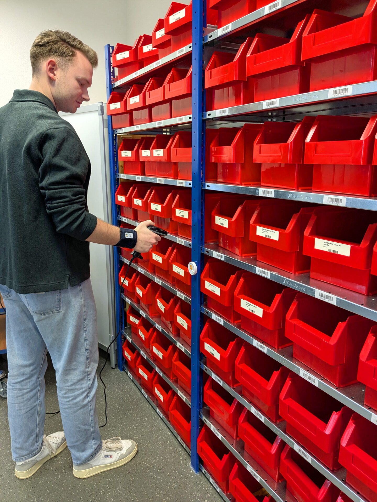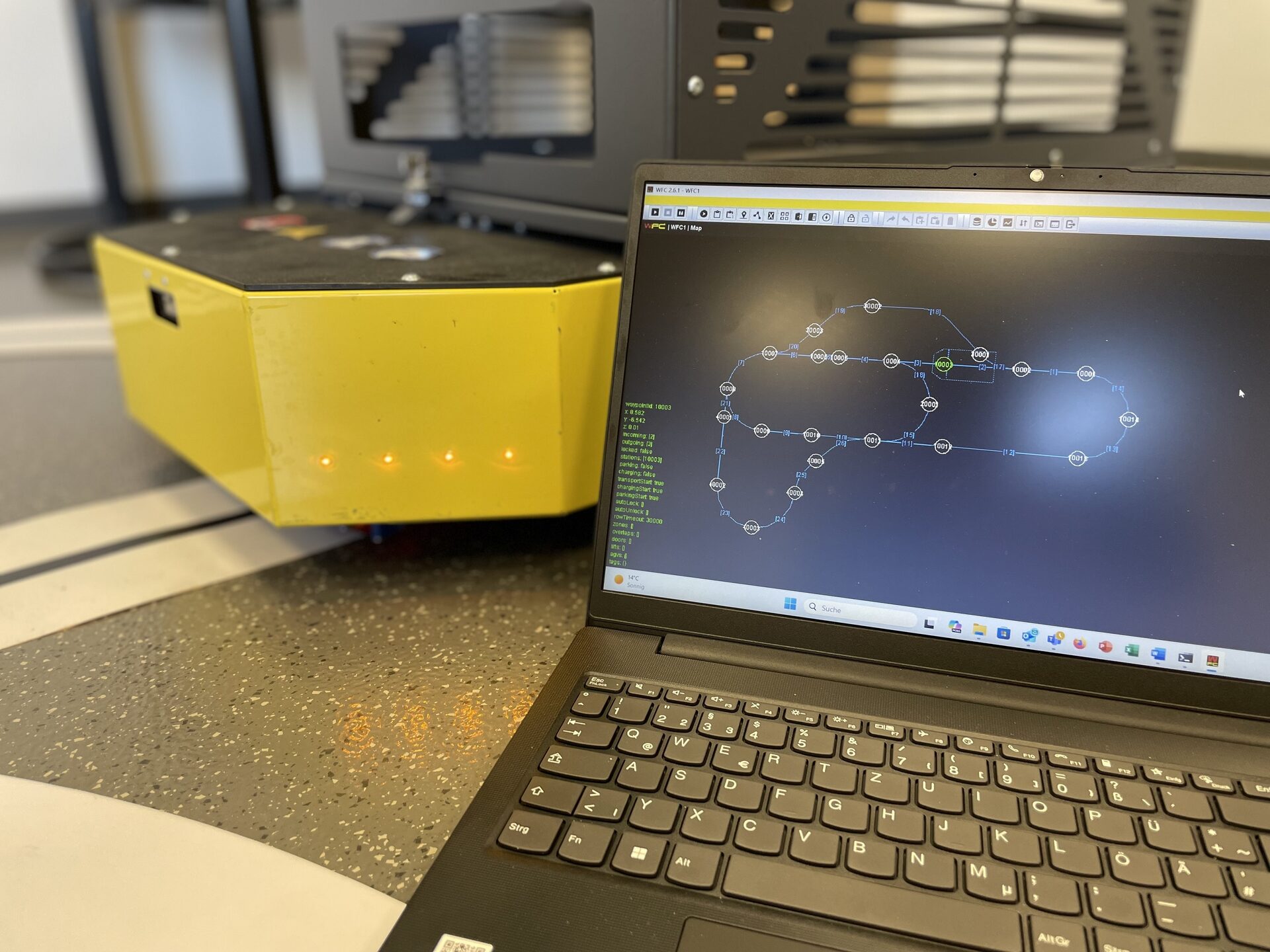 Self-driving transport vehicles such as the Weasel Lite transport goods between workstations, while barcode scanners and multi-code readers ensure precise identification of orders and containers. Sensors, including laser distance meters, monitor environmental conditions in real time. A SCADA and ERP system ensure seamless data processing and form the basis for a digital twin of the processes. In addition, the MotionMining system enables data-based analysis and optimization of ergonomics and process efficiency.