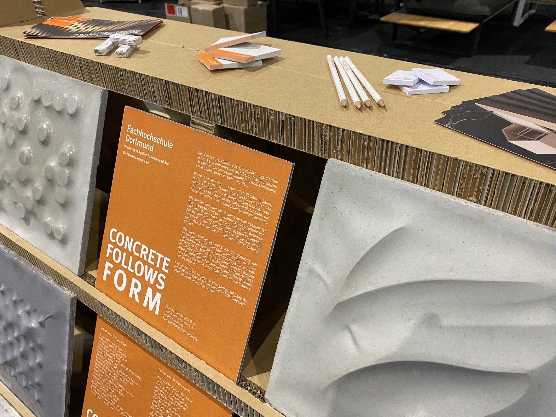 Zu sehen waren an drei Messetagen unter anderem die Ergebnisse der Lehrveranstaltung „Concrete follows Form“ des Lehrgebiets Baustofftechnologie sowie des Seminars „Spaceframes“ aus dem Lehrgebiet „Digitale Methoden in der Architektur“. „Wir hatten viele interessante Gespräche und konnten neue Kontakte aufbauen“, berichtet Daniel Horn, wissenschaftlicher Mitarbeiter am Fachbereich Architektur und Organisator des FH-Messeauftritts. „Jetzt sind wir bereits direkt dabei, die nächsten Aktivitäten und Ausstellungen zu planen.“