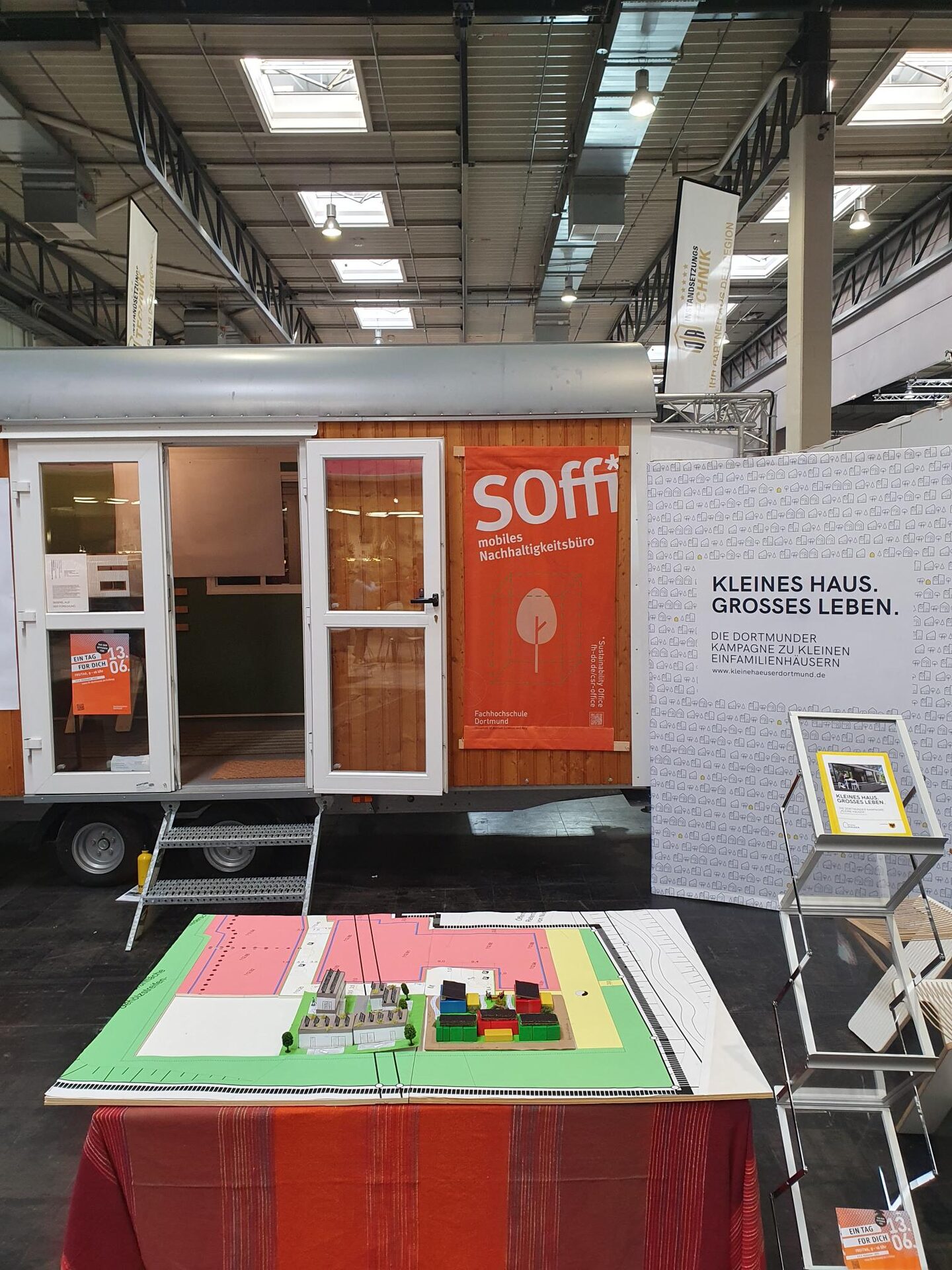 Auf viel Neugier stieß auf der Baumesse auch der Stand des Planungsamtes der Stadt Dortmund, wo das mobile Nachhaltigkeitsbüro „SOffi“ der FH Dortmund Station machte. Während die Stadt ihre Bauflächen im „Tiny Village Sölde“ vorstellte, präsentierte die FH ihren ungewöhnlichen Bauwagen – samt weiteren studentischen Abschlussarbeiten der Fachbereiche Architektur und Design zum „kleinen Wohnen“.