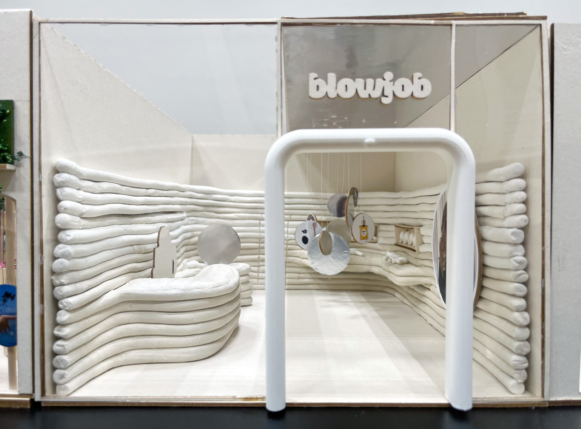Im Kurs „For Sell - Happy Shopping“ bei Prof. Ulrike Brückner haben sie sich auf das Phänomen „Fast Fashion“ fokussiert, Mode also, die unter menschenunwürdigen Bedingungen produziert, billig verkauft und nach kurzer Zeit wieder weggeworfen wird. „Die Mischung aus Umkleidekabine und Beichtstuhl haben wir gebaut, weil es uns um das Hinterfragen des eigenen Kaufverhaltens geht. Da schien der Beichtstuhl passend. Als Ablassbrief gibt es einen Kassenbon. Ist als Denkanstoß gemeint.“