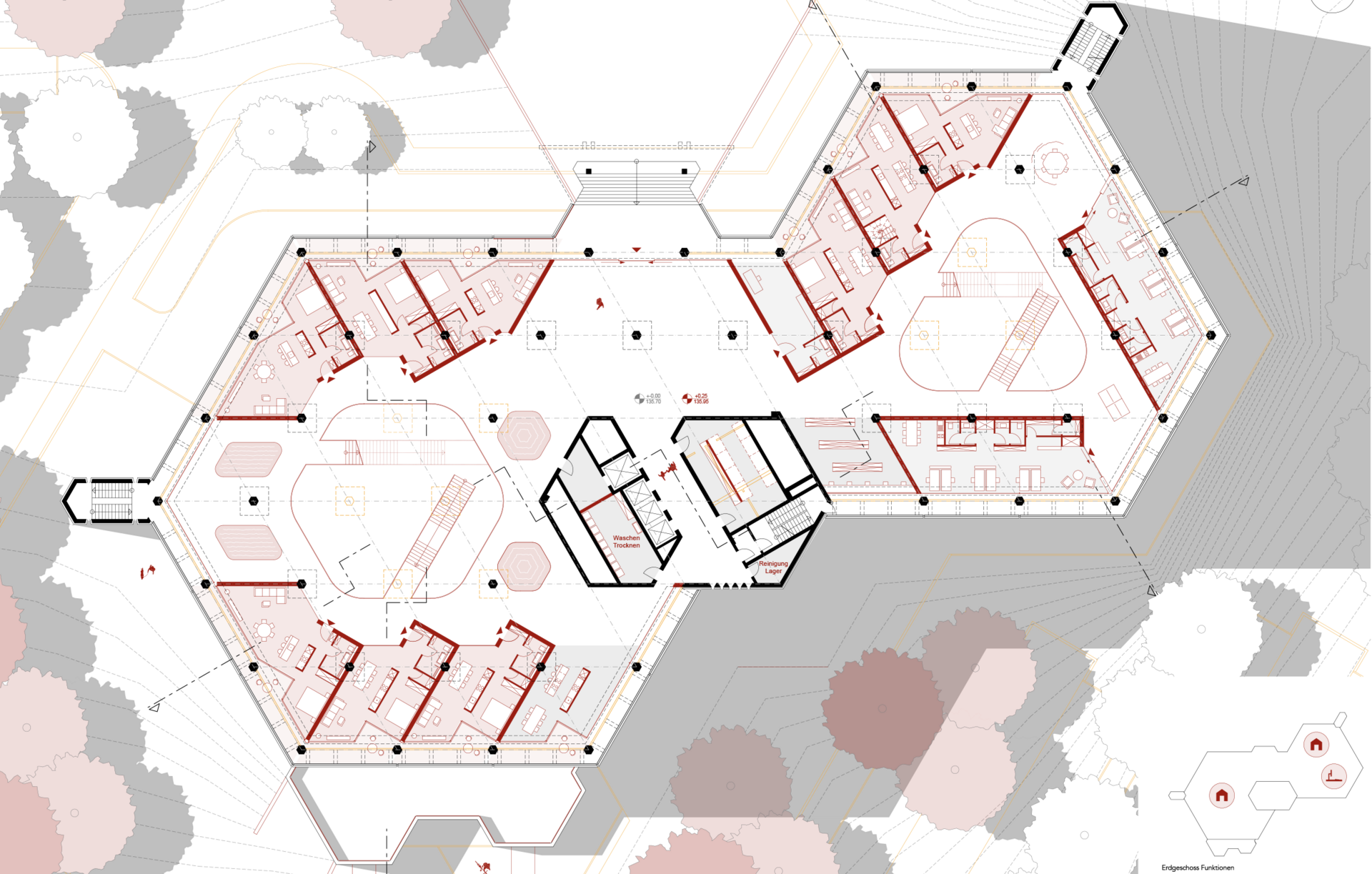 In his bachelor's thesis, Lennart Girkes develops a pioneering transformation approach for an administrative building from the 1975s. Instead of the planned demolition, he proposes a conversion into a diverse place to live and work, supplemented by sports and recreational facilities. At the same time, he pleads for the abandonment of the planned new housing development and instead focuses on reforestation. The work thus makes a strong contribution to the turnaround in construction and the preservation of existing structures.
