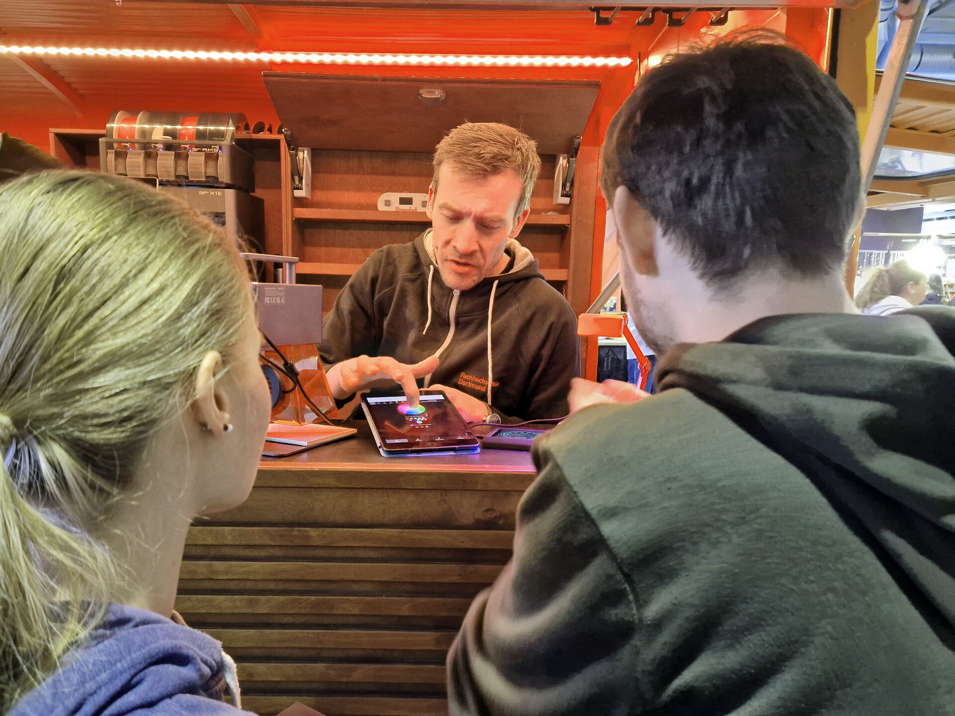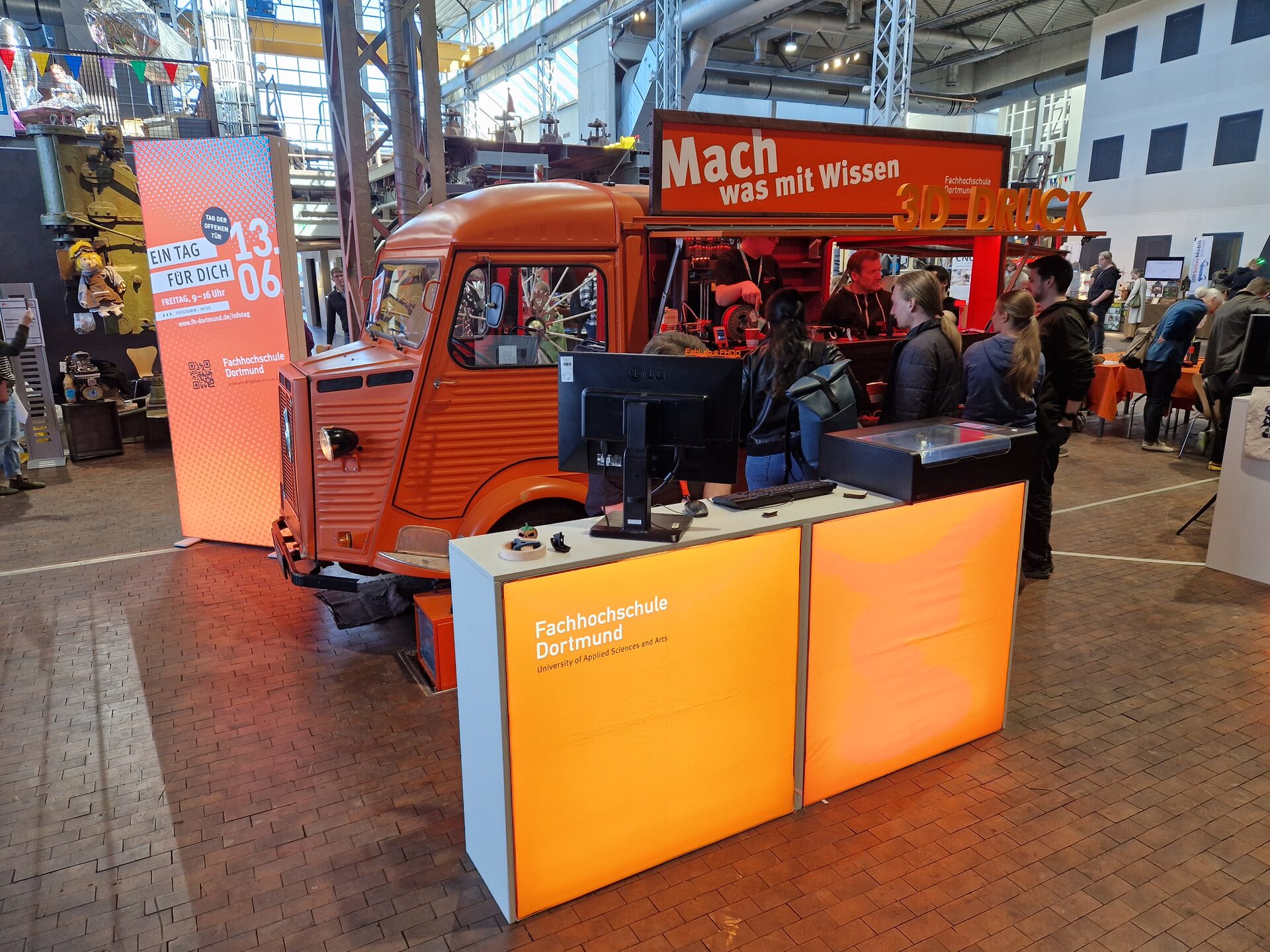 Zum Tummelplatz für Tüftler*innen aller Altersklassen wurde die Standfläche der Fachhochschule rund um ihren HY-Oldtimer (Öffnet in einem neuen Tab) – prominent platziert mitten in der DASA-Stahlhalle. Hier ließ das Team vom „FabLab (Öffnet in einem neuen Tab) “, dem Maker-Space der FH Dortmund, alle Besucher*innen selbst aktiv werden und Technik hautnah erleben. Wer wollte, konnte eigene Baumwolltaschen gestalten, dafür an einer Folien-Plottstation individuelle Motive entwerfen und die Textilien mit einer Transferpresse veredeln. Auch selbst mitgebrachte Shirts waren bedruckbar.