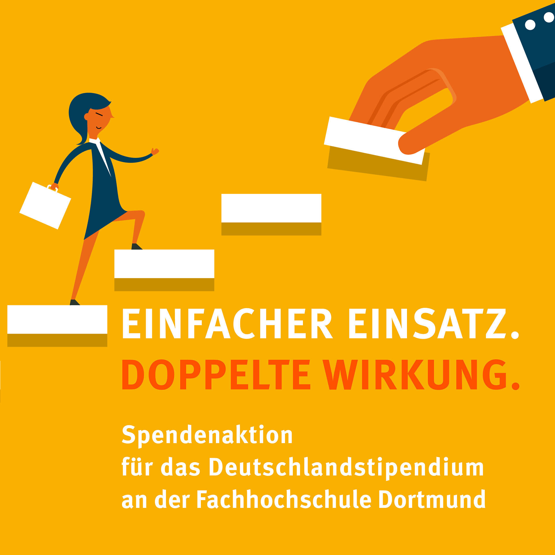 Wir sammeln alle Spenden auf dem Konto der Fachhochschule Dortmund. Ist jeweils der Betrag von 1.800 € erreicht, verdoppelt der Bund die Spendensumme und es kann ein Deutschlandstipendium für die Dauer eines Jahres im Wert von 3.600 € vergeben werden. Ihre Spende wird zu 100% für ein Deutschlandstipendium verwendet.